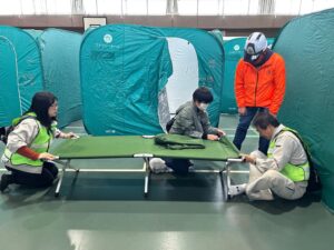 午前8時地震発生 → 安否確認&情報伝達訓練 → 避難所開設・受付・運営訓練 → 物資配給訓練