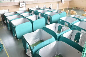 午前8時地震発生 → 安否確認&情報伝達訓練 → 避難所開設・受付・運営訓練 → 物資配給訓練